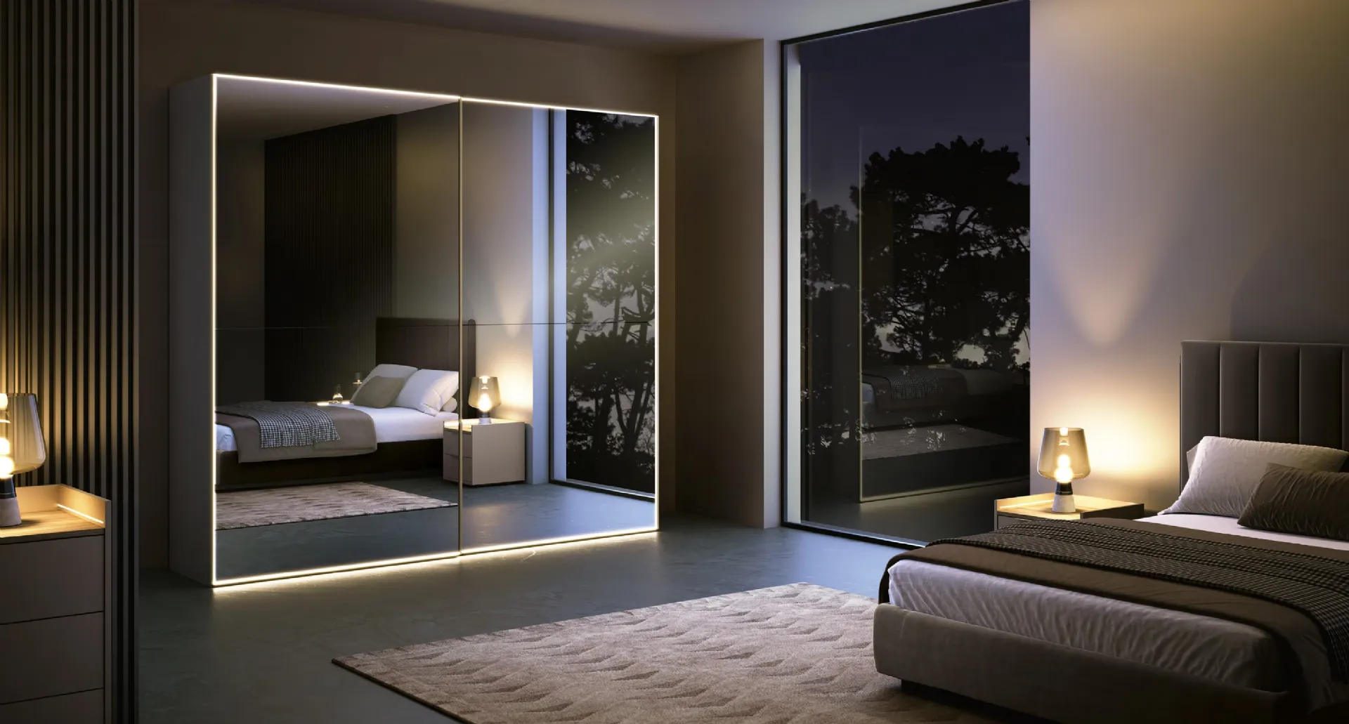 Se vuoi una zona notte ammobiliata al meglio, scegli l'armadio Koral Glass con ante scorrevoli di Adriatica!