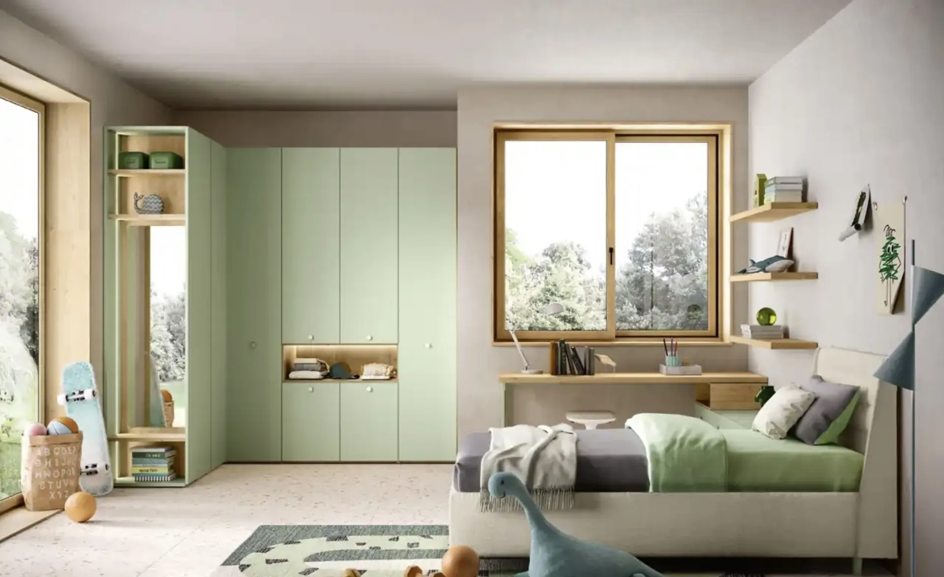 Arreda stanzette moderne con le Camerette componibili Moretti Compact Camerette! Il modello K117 in laccato opaco è per bambini.