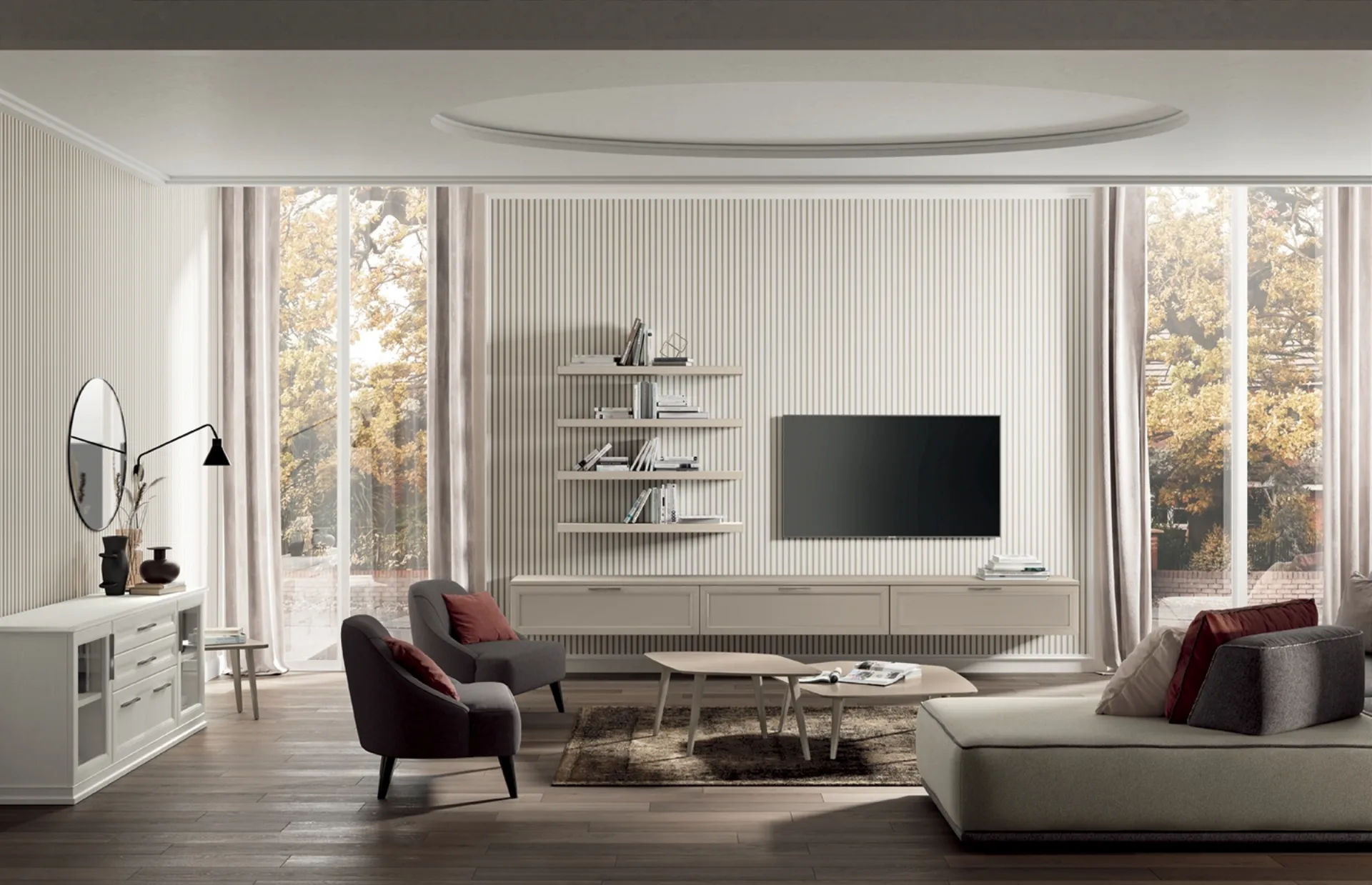 Se vuoi completare un soggiorno dinamico e operativo dalle linee classiche, ti offriamo la parete attrezzata Arcadia AS009 Colombini Casa.