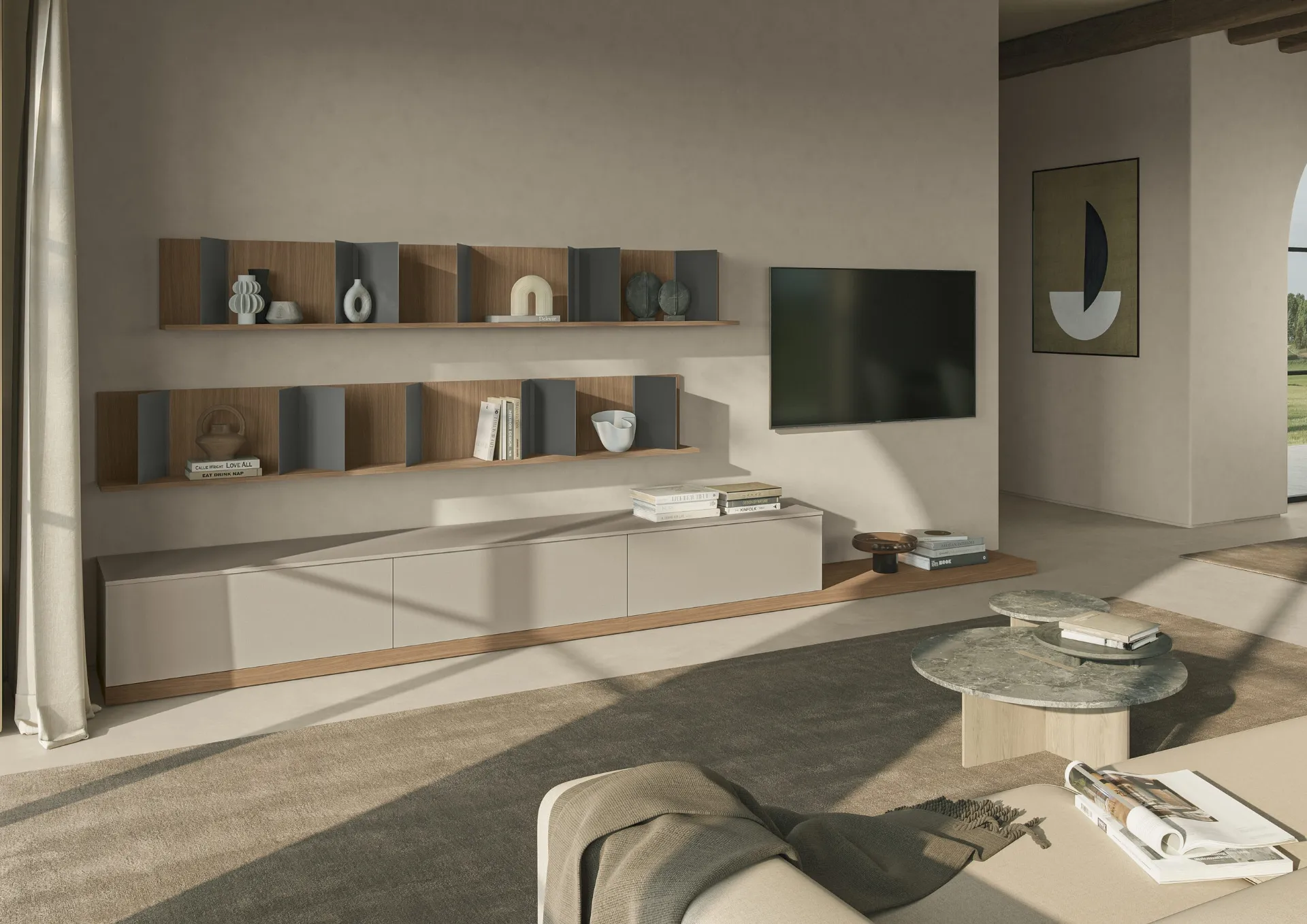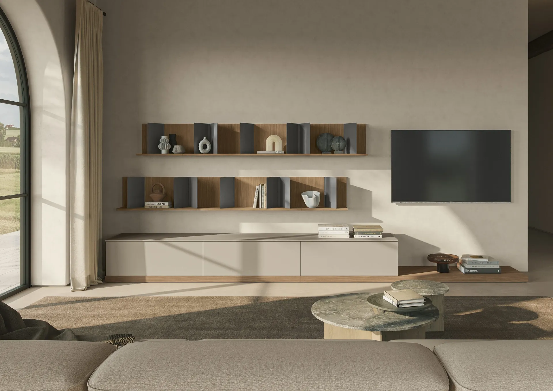 Vuoi progettare un soggiorno operativo e pratico? Ti presentiamo la parete attrezzata Night & Day L01NS Colombini Casa dalle linee decise moderne.