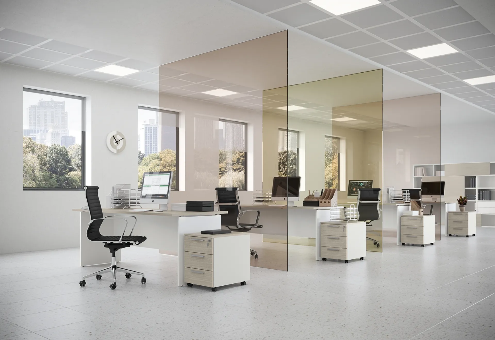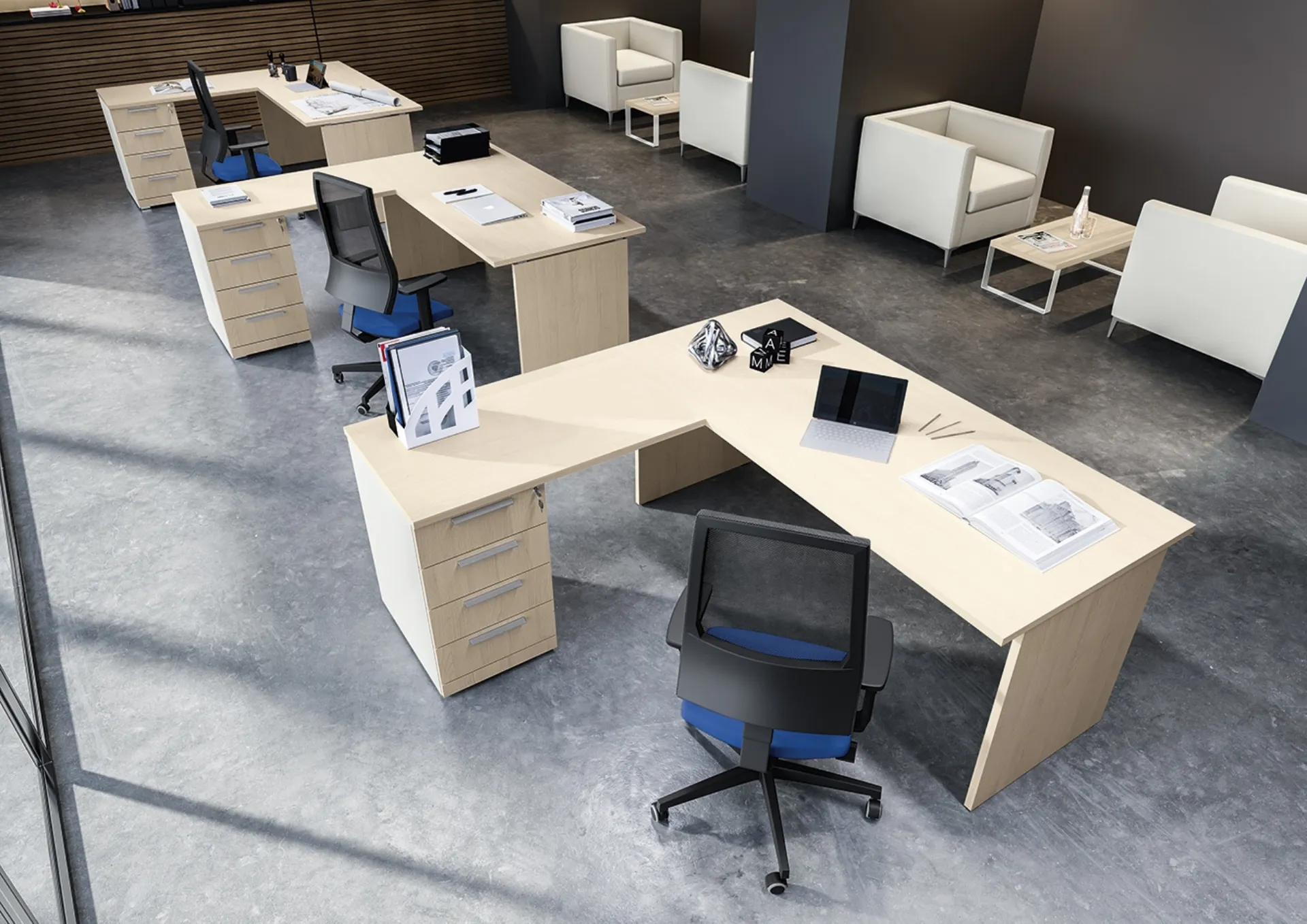 Vuoi ammobiliare l'ambiente lavorativo? Eccoti differenti proposte di scrivanie operative in melaminico, come il modello Teko Panel di Colombini Office.